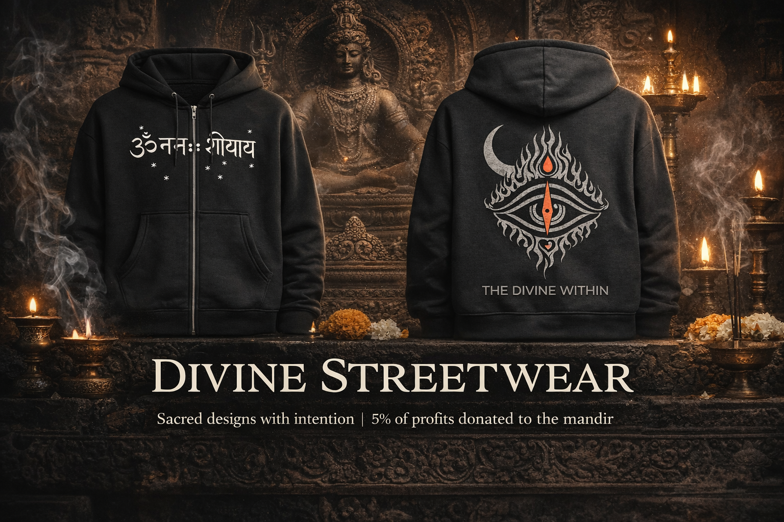 Premium heavyweight zip hoodie featuring sacred symbolism and bold back artwork. Designed with intention. 5% of all profits are donated to the mandir.